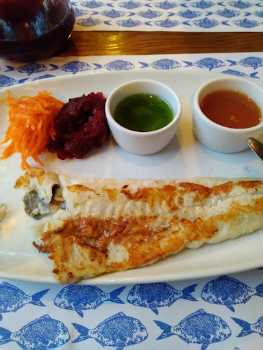 Находясь в Калининграде, не вижу смысла идти в ресторан итальянской или какой-то другой кухни, или места с замахом на премиум сегмент - как например "Соль", в которой я была единожды, если по уровню они не дотягивают до Московских. Поэтому при выборе мест к посещению, мой выбор пал на рестораны с локальными продуктами - т.е. местной рыбой. Первый минус, который я заметила - опечатка в меню, если честно, такие вещи приводят в ярость и отбивают аппетит. Сразу создаётся впечатление, что владельцам и персоналу настолько плевать на клиентов, что они не удосуживаются убрать опечатку/ошибку и продолжают жить по принципу "и так сойдёт". Остались, потому что нас встретил замечательный официант - Всеволод и время было уже позднее, в другом месте мы бы уже не успели поужинать. Килька во фритюре была замечательная, свежая и вкусная. Но какой же ужасный был тартар, вам нужно срочно что-то делать с текстурой и вкусовыми показателями этого соуса, ужасный уксусный вкус, перебивает вкус рыбы и вообще забивает рецепторы. Судак на гриле свежий и нежный. Судак в азиатском стиле полный провал, кисло-сладкий соус и темпура, забивают вкус судака и только по текстуре, понятно, что ты ешь рыбу, но ее вкус не чувствуется совсем. Рыба, очень классный продукт и если она свежая, не стоит забивать ее вкус, соусами и панировкой, это ужасно. С таким же успехом, я могла бы купить сухариков и просто их погрызть, но я заказала рыбу и хотелось бы чувствовать вкус рыбы, а не масла и темпуры. Теперь не про кухню, но это тоже важный фактор. Туалет ужасный, он чистый, но запах внутри, как у вокзального грязного туалета. Цветы в горшках в зале, затянуты в пленку, что тоже отвратительно. Учитывая опечатку в меню, а так же эти недочёты в оформлении интерьера и запахе в туалете, сразу ясно, какое отношение у владельца к клиенту. Пожалуйста, обратите внимание слово форшмак, но...