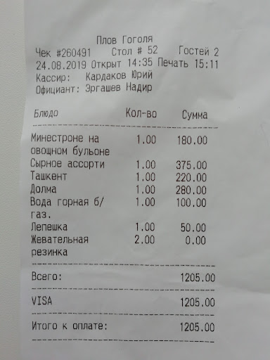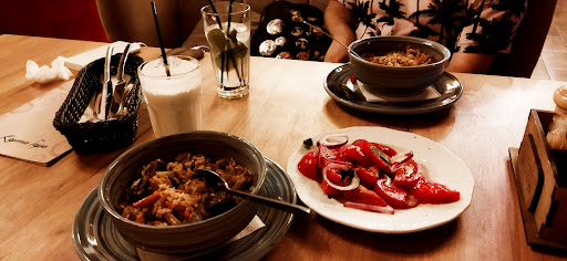 По сравнению с другими местами этой сети, данное место считаю самым устаревшим которому давно нужен ремонт и реорганизация. Начнём с самого начала. Приехали на парковку, много парковочных мест , что удобно для центра если вам нужно пообедать . Сели за дальний стол, два дивана друг против друга были прожжены от кальяна, сидели на дырках. В помещении очень душно и помещение напоминает собой офисы, будто из офисов решили сделать Кафе. Дышать невозможно, вытяжки нет как и кондиционеров, все в дыму от кальяна и запахи Кухни. Сделали заказ, овощи на гриле , плов , 2 бутылки вина и пару порций шашлыка . Овощи принесли обугленные, перец болгарский был полностью чёрным . Ни официант, ни повар не подумали наперёд о том, что подают угли вместо еды. Официант забрал и поменял на новую порцию, где перец был так же обгоревшим. Шашлык вкусный , хинкали тоже , цены как и везде в плове. Веранду очень хвалят, но к сожалению я там не был так как был уже не сезон . В данное место больше не приду , рекомендую сделать косметический ремонт и проверить подачу блюд от поваров . Подача блюд была долгой, овощи 45 минут, шашлык час . Молочный коктейль тоже около 45 минут.