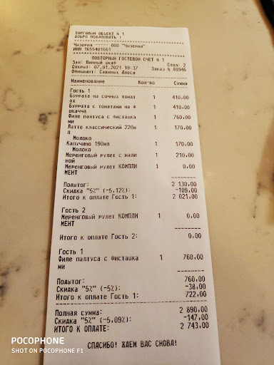 Так вот, при расплате, нам принесли предчек, где не было палтуса и меренгового рулета, и тут же подошла администратор Валерия, но я могу ошибаться в имени. Так вот, администратор начала что то рассказывать, что она сначала удалила рыбу, но её надо все равно оплатить, раз я её съела и раз мне её переделали, и что она мне принесет на неё другой чек. Вот тут слов нет. Ну вы тогда уж все в один чек занесите или вообще эту позицию уберите совсем. Это ваш косяк. Комплимент в виде рулета прекрасно, но косяк то ваш!!!! Я бы слова не сказала, не хотелось портить впечатление о ресторане, если бы не эти беседы с администратором о разных чеках и с требованием оплатить рыбу, как будто мы нищеброды и пришли нахаляву поесть.