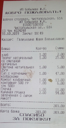 Read moreХочу выразить огромную благодарность всем работникам столовой на Чистопольской 61а. В течении года школьники Екатеринбурга приезжают на тренинги, экскурсии и в Республиканский лагерь Территория Мы г Казань и конечно неизменным местом питания является Добрая Столовая, которая всегда радует широким ассортиментом, потрясающей выпечкой, всегда всё свежее, качество и быстрота обслуживания и конечно цена. Но в эти осенние каникулы с 28 октября группу в 54 человека принимала столовая на Чистопольской 61а. Всё чётко по времени,чистота, быстрое обслуживание, всегда всё горячее, свежее, приготовлено с любовью и душой, как дома. Ни одно блюдо никогда не повторялось. А руководила всем этим хлопотным процессом зав столовой Жанна Николаевна. Спасибо вам и всему коллективу за ваши вкусные, домашние завтраки, обеды и ужины. Региональный руководитель и куратор детского проекта УМНЫЕ ПУТЕШЕСТВИЯ г Екатеринбург Голубева...