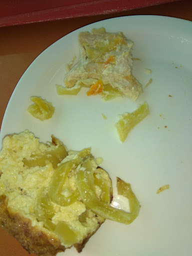 Если в других "добрых столовых" порции имеют один размер, то здесь они уменьшены опять процентов на 30-40%. Например грудка из блюда "грудка с яйцом и перцем" здесь вместо 50 грамм весит 30 (на фото она находится в верхней части). И вся спрятана под взбитой смесью из майонеза с добавлением яичного вкус (в нижней части). Еда обильно заливается подсолнечным маслом. Не легким маслом, а каким то тяжелым, как после прожарки. Поэтому если вы приверженец здорового питания, то лучше избегать таких мест. Да, эта вредная еда относительно дешева. Но...