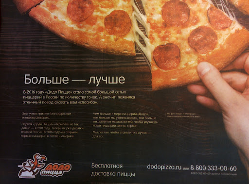 Read moreСделал два заказа одновременно, но для одного воспользовался услугой "заказ ко времени". Сделал это для того, чтобы все гости моего праздника смогли своевременно поесть горячую пиццу, но у менеджера кафе были другие планы. Он заметил, что заказы технически можно отправить за один заход. Из-за этого гости ждали первую партию пицц 58 минут, а гости, для которых я заказал вторую пиццу ели ее уже холодной, т.к. ее превезли за 8 минут от начала заказа. Написал в поддержку, мне ответили, что менеджер поступил правильно, что везти в два захода заказы было не целесообразно. Делаю вывод, что ДОДО пицца в лице менеджера поддержки и ресторана на Николая Ершова ставит свои интересы над интересами клиента и нисколько этого не стесняется, имейте ввиду. Пицца неплохая, но цены растут, а сервис становится все хуже и хуже.