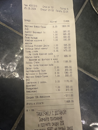 Ну и наконец, из-за чего, я всё же решила написать отзыв: Заказав 2 устрицы, мне принесли одну, тк другой не было в наличие. Итог: в чеке, вторая устрица, все же оказалась, и мы за нее заплатили.