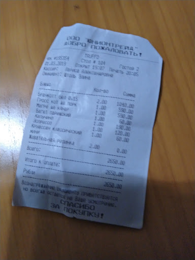 Read moreБыла наслышана об этом заведении, но впервые довелось там побывать только вчера. Наиболее комфортные для отдыха столики лучше бронировать заранее, хотя в пятницу вечером нашлись места без брони. Не знаю, что насчет основного меню, но десерты очень вкусные, не приторные, без химического привкуса - не самые низкие цены оправданы. Но тортики безумно калорийные. Того десерта, который я хотела, не было в наличии. Неужели так сложно было на время убрать его из меню на планшете? Кофе вкусный, но ничего особенного. В "Бинхартсе" вкуснее. Ооочень навязчивые официанты. Все-таки в подобные заведения ходишь отдохнуть, и хочется приватности. А тут постоянно сами подбегают, объясняют, как пользоваться планшетом с меню, спрашивают, чем помочь, бесконечно уносят не только посуду, но даже салфетки... Конечно, ребята весьма "френдли" и "хелпфул", но это явный перебор. Интерьер не слишком уютный. Стиль вовсе не французский, а постсоветский. Нет приватных зон - мне это напомнило столовую в санатории (только там не нарезают круги официанты). И тут Truffo уступает более бюджетным "КофеБин", "Бинхартсу", "Кофеину".