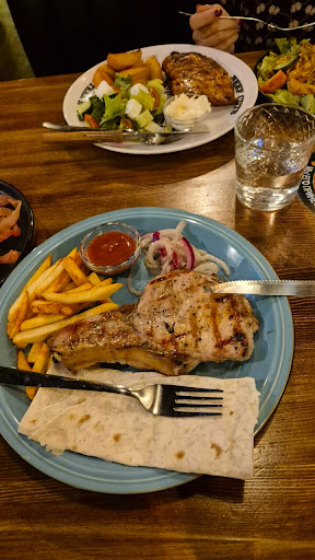 На неделе впервые посетил данное заведение, друзья настаивали чтобы оценил. И я оценил😊 Заведение имитирует ирландский паб, всюду флаги, вывески и прочая атрибутика, так как заведение в городе существует давно, всё уже потрёпано, на мебели имеются сколы и потёртости. Персонал имитирует псевдобрутальность, состоит только из мужчин, которые не улыбаются и вовсе не стараются расположить к себе, как это принято в сфере сервиса, бородатые официанты приносят блюда с каменными лицами. Через динамики по всему заведению, даже в туалетах, звучит стилизованная музыка. В туалете тесно, дверь едва не касается унитаза, видимо из-за экономии пространства. Заказ принимает бармен, официанты только приносят блюда и забирают посуду. Столы убираются плохо, есть крошки от предыдущих посетителей. Неулыбающийся бармен принимает заказ отстанённо-холодно, без какой-либо клиентоориентированности. Решил заказать чай и бифштекс дня и чай. Блюдо состоит из: хорошо прожаренного рубленного бифштекса, поверх которого жареное яйцо,рядом картофель дольками, половинка маринованного огурчика, лист салата и соус: майонез+сыр. Бифштекс на разрезе сочный. Всё содержимое тарелки особого восторга, чтобы прийти ещё раз, не вызвало;очень заурядно, но вполне съедобно. Повара без головных уборов, и вовсе без поварской формы. Заведение на любителей подобного антуража и пива. Нет клиентоориентированности, сплошная имитация, не располагает для регулярного посещения, блюда обыденные, без детальной проработки шеф-поваром или технологом. Никогда не видел ирландцев с каменными лицами, которых тут зачем-то пытаются...