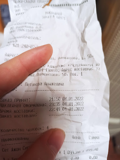 Read moreХабаровск Заказ сделал в 2:57 В 4:10 позвонил оператору, "уточню перезвоню" В 4:25 повторный звонок "уточню перезвоню" 4:35 третий звонок, "уточню перезвоню" В 4:50 четвёртый звонок, "Курьер будет в течении 10 минут" ну мне об этом конечно же знать не нужно. Никаких скидок за столь длительное ожидание не предусмотрено. Пицца приехала холодная, в наборе к суши была одна палочка. Сижу, смотрю на надпись на сете "быстрая доставка" ржу в голос. Сразу видно внимание и клиенториентированость и разговоры то записываются и работу с сотрудниками проведем. Ну прям молодцы) Столкнулся с конторой первый и последний раз. Жаль только отзыв вы будете читать когда будете в...