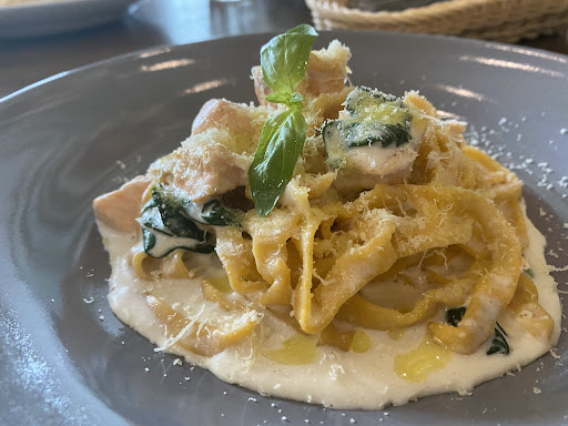 So far have been there twice, and may say it is a good discovery if this summer. Definitely returning to try other pizzas, risottos, and bruschettas. Regarding this particular location I like the friendly, relaxing atmosphere. And the cozy and beautiful decor. I believe it is good for friends, family gathering, dates as well. Today even went for a dessert - a chief special. Well, yummy it was. I definitely like pizza there. On a very thin but tasty dough, was a delicious combination of rukkola salad, chicken, cheese, or mushrooms with spinach and sauce, of course. That's just what I tried, but there are more. And I like this additional...