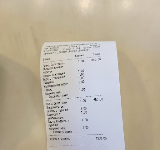 Заказ 2: были заказаны 2 порции 1го и того же салата "Цезарь". Курица была странно неприятной на вкус. Мы предположили, что это из-за борща, который мы пробовали до этого. P.S.: До этого были в этом же кафе, и нам каждый раз приносили холодные супы не первой свежести. 21.08 мы решили прийти в кафе, чтобы понять, следует ли приходить туда ещё раз и советовать его своим близким/друзьям/знакомым из России и других стран.