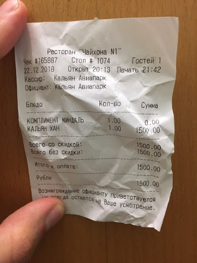 Здравствуйте. Вчера 22.12.2018 в 20 часов, я с девушкой посетил Ресторан «Чайхона N1» в ТЦ Авиапарк. При входе, меня встретила девушка в розовом платье. Я спросил у нее 3 раза, пока она провожала нас до столика у окна, у вас в ресторане делают скидку в день рождение на кальян? Она сказала да 20 %. 3 раза она сказала да, мы делаем на кальян 20% в день рождение. Хорошо. Так как мы частые посетители Чайхоны N1,только в ТЦ Метрополис, персонал хороший, отзывчивый и добрый. Но, в ТЦ Авиапарк мне через 4-5 сотрудников позвали ели-ели менеджера. Пришел менеджер, я сообщил ситуацию, что у меня день рождение, согласно постам в вашей группе в день рождение скидка 20 % и девушка при входе сказала 3 раза, что да так и есть. У меня не оставалось сомнений. В конце, когда принесли чек, был 1500 рублей. Менеджер сообщил, что у них скидки на бар и меню, а на кальян нет. И вообще, вас ввели в заблуждение девушка на ресепшнне и группа в вк. В группе в Вк сказано, возьмите только паспорт и вам будет скидка в 20 процентов, никаких примечаний не сказано, а значит публичная оферта. Менеджер женщина, начала мне показывать какую-то табличку, не знаю откуда она ее взяла, и показывала на маленький шрифт на этой табличке что кальян якобы не входит в скидку. И просто взяла и ушла, то есть для нее это нормально взять и уйти от клиентов которые в недоумении от происходящего. Я показывал до последнего ваш пост в группе в Вк, но менеджеру было все равно, она развернулась и ушла. Праздник день рождение мое было испорчено, я очень разозлился на весь ваш ресторан! Заплатил 1500, и ушел! Очень обидно и подло, что такая подстава! Сидеть не удобно, как кушетки жесткие диваны, даже диванами сложно назвать. Карты не принимают. Готовьтесь что по итоговой сумме, вам могут сказать что-то новенькое или показать с непонятных бумажех их, что они якобы во всем правы, главное чтобы клиент не был прав. Отношение хамское, особенно менеджера. Угли меняли 1 раза за 2 часа, и все кальянщик больше не подходил и ничего...