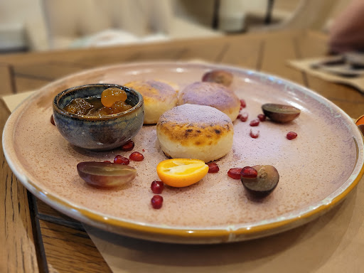 Меню, скорее европейское, кавказских блюд маловато - мясо на мангале, сыры, хачапури. Что касается заказанных блюд, то, несмотря на приятные цены, мы были даже несколько разочарованы Не сказать, что не вкусно, но еда явно на 3+. Лимонад собственного приготовления «черника-имбирь» оказался химозно-синим - в основе газировка и сиропы. Хачапури по-аджарски даже не хотелось доедать. Отзывы особенно отмечали десерты, но чизкейк очень разочаровал. Это не чизкейк - это ванильный мусс - совершенно другие вкус и текстура. На любителя. Блюда на мангале вполне ничего, на четвёрочку.