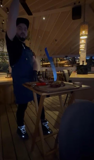 Read moreНашла это место по отзывам. Красивая входная группа, около гардероба витрина с именными ножами постоятельцев с гравировкой. Мы искренне надеялись на вкусное мясо. Заказали рибай 5100 и филе миньон 3000+ с овощами на гриле. Прибежал мужчина восточного вида и начал задорно втыкать нож в доску и нарезать мясо. Мясо казалось очень мягким:((( Мы уже предвкушали вкусное мясо, но не случилось. Рибай получился как подошва, а миньон был обожжен на открытом огне, верхний слой был из-за этого был с горчинкой и суховат. Миньон снаружи был с толстыми волокнами и они так прекрасно врезались между зубов, внутри было розовое мясо. Овощи на гриле, казалось бы, однако они не были вкусными. Шляпка шампиньона с водой (скорей всего был просто разморожен), кукурузка была маринованая, а не свежая. Фотографии вкус не передают☹ Официантка пригласила менеджера, нам предложили переделать мясо, но мы не хотели ждать и были голодные. Погрызли без удовольствия, с твердой уверенностью, что сюда не вернемся. В качестве утешительного приза нам предлагали десерт, мы отказались. Но взяли чай. Откровенно говоря, я думала, что мясо будет лучше. Вместо шоу у стола я предпочла бы...
