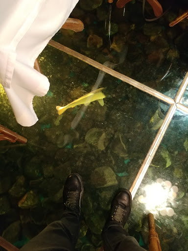 Read moreČuveni riblji restoran sa svojom atrakcijom - akvarijum ispod staklenog parketa. Bilo je pomalo i hladno tokom ručka, verovatno da zbog dizajna grejanje nije moglo da bude sprovedeno, ali izuzetno profesionalan konobar je odmah ponudio ćebe i zamolio ocenu da li možemo da boravimo duže ili da se premestimo. Dizajn je interesantan, ali po toaletu se vidi da je restoran ipak skoro 30 godina star. Sve je čisto, mirišljavo i uz muziku. Meni je interesantan, uz skupe cene, ali kvalitet se oseća. Preskupi su topli napici, apsolutno nema razloga da već viđena limunada od 750 ml košta 1200 rubalja. Razumem da rak ili školjka toliko koštaju, ali ovo je neposlovno što se tiče napitaka. U meniju ima pored ribe i mesa. Porcije nisu da se najedeš, jelo koja je meni bilo interesantno je sadržalo ljuti sos, koji nije bio baš ljut. Crna pasta je apsolutno ukusna, salata standardno, nedostajao je neki sos da poveže sastojke. Servis je sjajan, mesto interesantno, ali neki refreshing...
