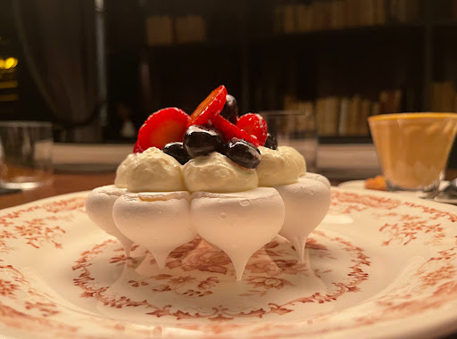 Очень люблю здесь Павлову. Лучшая на мой взгляд ее вариация, неприторная, много ягод, а еще милая забавная подача - безе перевернуто пиками вниз, и выглядит на тарелке словно облачко на ножках, как пухлая...