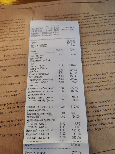 Read more+: Бар/Ресторан расположен удобно, в центре города, недалеко от центральных улиц Красноярска. +: Внутри приветливая и уютная атмосфера, приятный интерьер, необычные и интересные решения, которые подчёркивают литературную концепцию заведения. +: Отличное обслуживание в лице официанта - Александра, я бы даже сказал на столичном уровне. Предупреждают о тонкостях состава блюд и порядке их употребления, наличии ингредиентов-аллергенов на этапе заказа, что отдельно порадовало. +: Наличие комплимента от ресторана, что позволило попробовать новое блюдо и сразу сформировало благоприятное отношение к заведению. +: Приемлемые цены на еду и высоковатые за алкоголь, но учитывая барную составляющую на среднем уровне для города. +: Весьма вкусные и разнообразные блюда с интересными новинками и достойными кулинарными решениями, я остался доволен практически всеми заказанными позициями. Спасибо поварам за высокое качество приготовления и менеджерам за свежие и вкусные ингредиенты. Для ресторана, я считаю, это самый важный пункт. Хоть в меню и немного блюд, но все их интересно будет попробовать. Приятная посуда, выполненная в едином стиле.