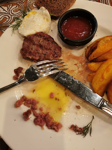 В меню бизнес-ланча есть "Реберный бифштекс с углей с жареным яйцом и соусом блэкпэппер". Качество этого блюда гуляет из раза в раз. Его Вам могут подать приготовленным не на углях, а на простой сковороде, он может отдавать керосином. Последний раз, когда я его заказывал, мне принесли абсолютно сухой и пережаренный бифштекс. Администратор целиком согласилась со мной, что блюдо приготовлено неправильно, принесла извинения и заверила, что мне принесут новый бифштекс в течение 10 минут. Действительно принесли: бифштекс с сырым фаршем внутри. Спасибо, я всё понял.