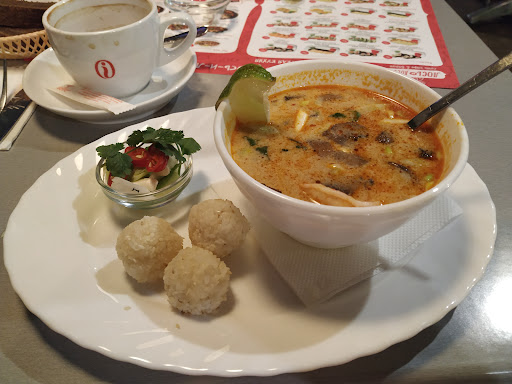 Лось и лосось крайне не впечатлил. Не понравилось практически все. Ну во первых, это такое демократичное заведение и заказ нужно сделать на кассе. И там вас ждёт огромное неудобное меню я не очень поняла с какой кухней. Вроде и восточная и европейская есть, но сразу разобрать трудно. Кассир никак не помогает вам сориентироваться в меню. Лично меня бесят фразы типа: у нас все вкусное и тому подобные. Не у каждой бригады все блюда одинаково хорошо удаются, а во вторых, ну ты ж с людьми работаешь, ну спроси чего они хотят! В итоге спросила что быстро готовят, сказали роллы и супы. Заказала том ям, его а итоге принесли последним. Суп кстати не вкусный. А ещё к нему подавался рис скатанный в шарики и поскольку я не знала, катали их руками в чистых перчатках или нет, есть их не стала. Роллы практически все запечённые (фу). Есть комплексы по приемлемой цене, но в комплексе надо знать что брать, а то принесут зелёную жижу. Ах да, чем мне запомнится кафе - самым ужасным Цезарем, который я ела. Просто набор не вкусных продуктов, а не салат. Но зато он есть в меню. Из плюсов ещё цены, они вполне демократичные, но и еда типа столовая плюс. Плюсов пока больше не нашла. Про минусы. Приборы стоят на столе и видимо по этой причине их вечно не хватает. Ну и во вторых, как говорят вторая важная составляющая заведение питания это атмосфера. Интерьер мне не понравился, как то не уютно и наверное слишком темные тона. И очень темно. Днём в обед такая интимная атмосфера совсем не нужна. Вердикт: я туда больше не хочу. Не хочу попробовать что-то другое или сходить в другое кафе сети. Ну и совет: пригласите Константина Ивлева, может он научит вас готовить! И...