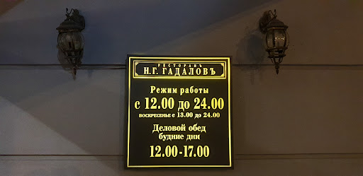 Read moreМы попали на этот ужин от шеф-повара. С помощью сертификата компании "Бонодоно" (программа гастрономический сет). Хороший ресторан с сибирской кухней. Интерьер оформлен старинными фотографиями города Красноярска. Шеф-повар Александр. Молодой, энергичный и словоохотливый парень. Рассказал про ресторан, про семью Гадаловых и про каждое блюдо, которые сам и приносил. Кухня вкусная. Скажите где вы берете такого свежего муксуна?! Приятно покушать свежей рыбы (муксун, нельма, стерлядь) и самое главное ни чего лишнего. Мясные блюда так же прекрасны. Особое место в дегустации заняли настойки. Хороши хреновуха и смородина, не удержались и взяли по бутылочке домой. Сам ресторан состоит из двух залов. Чисто, обслуживание...
