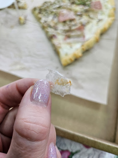 Read moreНачинки в купленной пицце оказалось откровенно мало, впридачу в одном куске оказался кусок пластиковой плёнки!!!! Чудом не подавилась, фото прилагаю. Больше никогда там ничего не куплю, такое вообще недопустимо! Человек может проглотить этот несъедобный кусок и пораниться жёсткими краями этой "плёнки". Фото прилагаю. Размер примерно 2×2 см. Цена на пиццу с учётом скудной начинки...