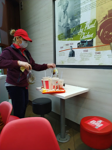 Находится на втором этаже здания. При входе нужно быть осторожным, потому что очень скользкий пол, который не только мокрый, но еще и покрыт грязью или какой-то слякоть. В самом KFC вроде бы большой зал с множеством столиков, но очень много людей! Можно сказать не уютно и больше похоже на какую-то забегаловки или пивнушку! Так воде бы обычный KFC, но очень много людей, которые просто сидят за столиками и копаются в своих телефонах(при этом ничего не заказывая) , а ближе к выходу сидят, стоят куча доставщиков в зеленой униформе... вообщем складывается впечатление, что на вокзале в зале ожидания! В туалете грязно и противно-лучше не заходить. В зале очень шумно и посидеть за чашкой кофе и решать какие-то вопросы или с кем то по делу поговорить не получится. Персонал KFC работает быстро, качественно. Приготовленная еда вкусная, недорогая, столики убираются персоналом быстро... Если бы не общая атмосфера, то можно было бы и поставить больше 🌟, но к сажалению толкотня, сидящие просто так и занимающиеся столики люди, толпящиеся доставщики создают отвращение.... Я был во многих KFC, но подобное...