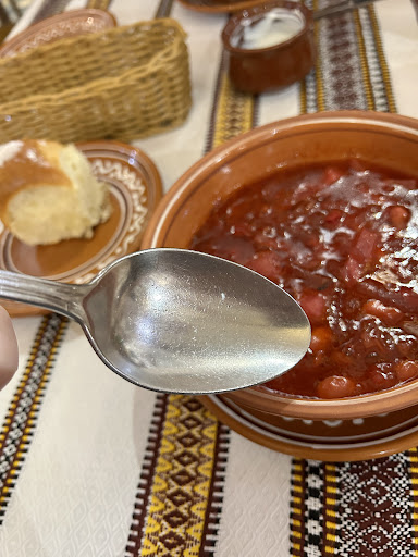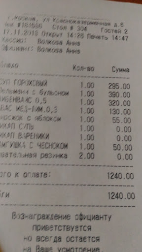 Одновременно принесли меню нашему столику и соседнему. Мы готовы были сделать заказ сразу, на что хостес обещала позвать официанта. Официант пришел минут через 5 и начал принимать заказ у другого столика, не приняв у нас заказ ушел. Пришлось опять ждать, когда кто-то из персонала пройдет мимо. Заказали 2 порции борща. Спустя 10 минут принесли только 1 порцию. Второй гость должен смотреть, как ест другой человек и ждать у моря погоды? Вторую порцию борща принесли с ложкой в жиру! Опять же, персонала на 1 этаже нет, как ее заменить? В туалете нет мыла, ее даже не помыть! В борще был 1 маленький кусочек мяса, меньше чайной ложки. Вы серьезно? Если бы я хотела постный борщ, я бы тогда его и заказала. НЕ ВКУСНО! Пампушка холодная и засохшая Как ранее уже отмечала, в туалете нет мыла Официант принес горячее и ушел, не смотря на то, что на столе стояла гора посуды от первого блюда. Попросили счет. Нам приносят терминал оплаты не спрашивая наличие бонусной программы. Зачем в чеке выбивать жевачки, если вы их не отдаете клиентам? Я понимаю, что они бесплатные, но сам факт. Порции значительно меньше, чем в других заведениях этой сети. Хотя ценник одинаковый Поменяйте приборы, они уже настолько заюзанные, что ими есть противно. Вы посмотрите на состояние ложки!