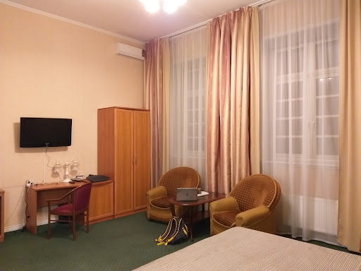 Read moreВ июне 2017 года мой день рождения выпал на воскресенье, а близкие друзья улетали в этот день, решили начать отмечать заблаговременно ночью)|Выбрала на букинге, отталкиваясь от рейтинга и наличия бесплатной парковки (кстати, указала при бронировании что в одного из гостей будет день рождения, но никаких бонусов/комплиментов не было) |Забронировала 2 стандартных номера с завтраками |Приехала самая первая, на ресепшене правда долго заселяли, заполняли бумажки, паспорт сканировали, ну это нестрашно, администратор типичная женщина из советского союза- строгая, но справедливая)|Отель совковый, богемный шик, ковры, золото, специфичная мебель, кому-то может даже понравится, окунуться в эту атмосферу, поностальгировать... это не мой стиль, но за эти деньги и на одну ночь в самый раз.|+|Парковка, просторный номер, уединенная обстановка, неплохой выбор на завтрак|-|Отель нуждается в ремонте, сложновато найти на машине, нет сейфа в номере||А в целом отели произвёл приятное впечатление, но думаю он рассчитан больше для командировок, нежели...
