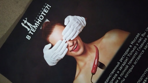 Read moreVip-сертификат в этот ресторан подарили на работе. Почитали с мужем отзывы и ожидали полной шляпы. В результате... Ну, думали будет хуже. В принципе неплохо, один раз сходить вполне стоит. Ключевое слово "один". Плюсы: Действительно интересно ощущать себя час без возможности использовать самый мощный канал обработки инфы, зрение. Вначале мозг как бы буксует и немного даже раздражение какое-то от того, что непонятно как выловить на тарелке последнюю креветку, где тут салфетки лежат и как вообще выглядит это пространство. Через минут 20 уже расслабляешься, больше внимания на музыку, на голос собеседника, на вкус еды. Официанты крутые, остроумные, во всем помогут. Чувствуешь себя комфортно. В качестве места для свидания идеально. Не боишься что-то сделать не так, что бросится в глаза везави. Не бросится.:) Но мы с мужем не первый день знакомы, так что этот пункт мимо. Еда неплохая! Рыбное меню действительно очень рыбное. В горячем даже нет гарнира. Сплошные рыбные филе и крупные креветки. Мясное мужу тоже понравилось. Десерт, алкоголь, даже кофе - все вполне приличное. Не на 7600, которых стоил сертификат конечно. Но это не ресторан, это скорее шоу.