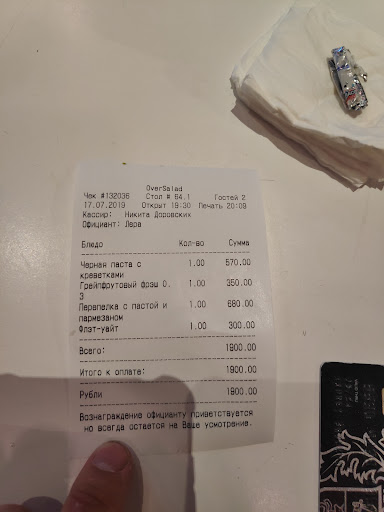 Долгая подача, но, как оказалось, это было связано не столько со временем приготовления, сколько с работой официанта. Я, сидя у прилавка выдачи еды, заприметил, как какие-то две тарелки готовых к выдаче блюд лежат там уже довольно долгое время, и вот ещё некоторое время спустя их приносят мне с другом. Заказана мной была паста с креветками в сливочном соусе из авокадо. За время ожидания паста успела остыть, а остывший сливочный соус - довольно неприятная субстанция. В блюде оказалась всего одна креветка (тогда я подумал, что изначально неверно прочёл в меню, но в чеке действительно оказалась "паста с креветками". Обманутые ожидания как от блюда, так и от заведения, за мой же счёт.