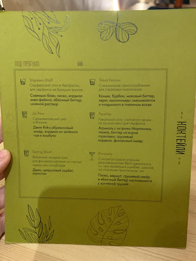 Частенько ходим в этот бар, классная атмосфера, персонал, еда и напитки. Бывали на квестах и просто отдыхали. Но последнее время стал очень разочаровывать, коктейли начали разбавлять, а в кухне особо ничего и не добавляется (кухня вообще отличная, но если вы следите за питанием как и я, то кроме фруктовой тарелки ничего не заказать, уточню, это, возможно, последствия карантина, все может и наладиться 😉). Но из-за напитков я очень разочарована, кальяна теперь тоже нет, выйти на улицу покурить, оставив вещи внутри и взять с собой коктейль, теперь тоже нельзя. Если возникает вопрос, куда пойти вечером и отдохнуть, то я лучше предпочту другой бар, где мне одного коктейля хватит на вечер, а не 4-5 в Прогнозе (и это не значит, что мне много надо, просто слишком заметная разница, да и цена тоже не особо отличается. В Прогнозе цена коктейля 400-500 р, на Менделеевской или на Центральном рынке 450-600). Звезду за это я снимать не буду, уж очень вы мне раньше нравились, надеюсь, вы поработаете...