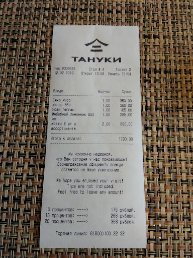 Read moreПоследний раз был в марте 2019 года. Раньше был просто отличный тануки, в которым были прекрасные порции ( мой индикатор ролы Филадельфия), быстрое обслуживание и хорошее руководство. Если хочется ролов, то всегда семьей ехали в тануки на каширке, хотя рядом с домом есть ругой (там отстой). Но когда пришли в марте, заметили изменения в худшую сторону по всем пунктам. Но это все ладно, самое интересное это был эпизод с официанткой, которая обслуживала наш столик. Она начала у нас принимать заказ, и мы принялись тыкать в картинки из меню попутно пытаясь выговорить название блюд (такая схема всегда срабатывала). Она записала заказ, в конце зачитала названия заказанных блюд и ушла. Через некоторое время блюда стали поступать на стол. И тут мы увидели что такие ролы ( ролы с огурцом) мы не заказывали, подозвав нашего официанта, и разобравшись выяснилось, что название этих ролов отличалось на одну первую букву от наших ролов. И казалось проблемы нет забрать эти роллы и принести нам наши, но не тут то было, официантка предложила нам есть то, что принесли, мол она нам в конце принятия заказа зачитала список наших блюд и мы удовлетворительно кивали и если она унесет ошибочные роллы, то ей придется оплатить их, на вопрос почему мы должны были оплачивать этот косяк, внятного ответа не получили, но потом она нас отчитала за невнимательность и заменила роллы на наши, и на этом конфликт...