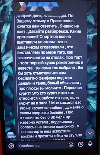 Неплохая атмосфера, но еда не вкусная абсолютно. Салаты ещё куда ни шло, но горячее есть невозможно. Шашлык забрали с собой, на следующий день доделывали, только так есть можно. Персонал ужасный. Алкоголь на столе закончился - новый на стол не приносили, хотя закупили мы много. Торт не резали, не носили пока моя маме не взяла сама и не отнесла. Половина персонала курит, сидит. Постоянно ныли "у нас вчера 60 человек было". Нормально работу не выполняли. Для мероприятия не советую. Жалею, что не остановились в другом ресторане. Впечатления о свадьбе испорчены. Дополнение: администратор ресторана увидел отзыв и вместо того, чтобы извиниться или по крайней мере проигнорировать отзыв нашла меня в вк и написала мне туда свой отзыв с огромным количеством претензий и оправданий. Впечатление о ресторане стало ещё хуже А, да, большой плюс ресторану то, что нам подарили живую музыку, где за каждую заказанную песню платили 200 (или 300, не помню) р, которую не пели, а просто включали. И то, что недорогая цена заведения. Но учитывая испорченное настроение сомнительный плюс. Даже за эти деньги хотелось бы...