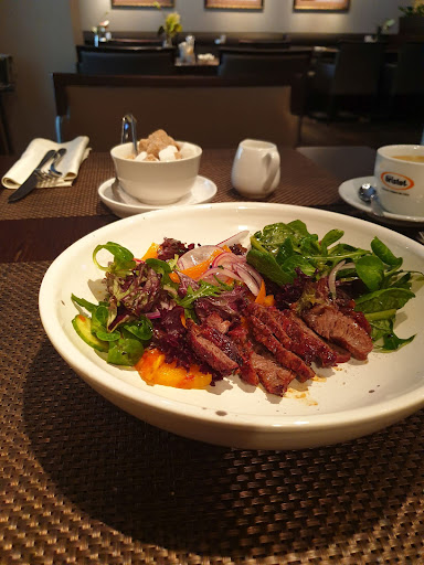 ЕДА В 14:00-15:00 основной контингент бизнес-ланчей уже ушел, но время приготовления осталось довольно существенным. Кофе 5 минут, сок 10, салат 15. Горячее около 30 минут. Посуда нормальная, без изысков. Подача могла бы быть лучше. Для ресторана высокого уровня, даже слабая. По качеству блюд хочу отметить несколько сухое мясо в салате. Рыбный стейк из осетра хорош, хотя и жарят его чуть сильнее (дольше), чем требуется. Изменения в меню возможны. Это хорошо. По соусам провал. Причем в том смысле, что повар не особо осведомлен о базовых соусах к рыбе. Предложенные по умолчанию в меню вполне хороши, но всё-же на любителя. Овощные свежевыжатые соки в ассортименте. Цены выше среднего. Трудно сказать насколько оправданы. Скорее да, чем нет, но нужно дорабатывать (или подтягивать) и атмосферу и сервис.
