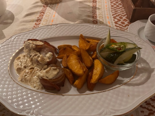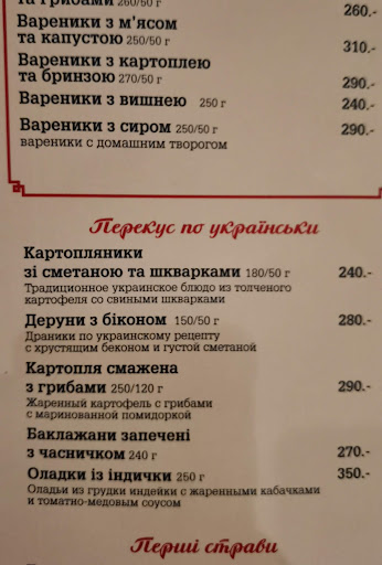 Read moreБыли дважды в декабре: с коллегами и мужа потом привела. Ну, очень-очень вкусно! Кушаешь и мычишь от удовольствия. Драники можно есть бесконечно. А какие настойки.... Моя любимая - хреновуха. Мужу больше клюквенная понравилась. Но они все удивительно хороши! Забегаешь с мороза, а у входа рюмочка встречает - сразу наиприятнейшее настроение. Внутри как в хате. Уютно, атмосферно, если прохладно - вот вам плед погреться. И чай с сушками. Или с тортиком, от которого наступает гастрономический экстаз ) В общем, это место стало для нас приятным декабрьским открытием. Мне, правда, перебор украинской музыки немного не по нраву,...
