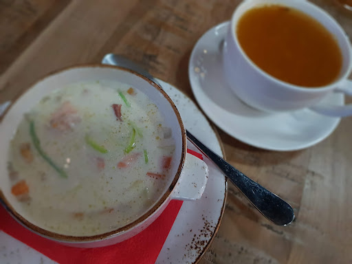 Read moreСелёдка не очень свежая. С привкусом. Лук в ней кольцами откровенно сухой. 😜 Похлёбка с колбасками - полные помои. Слили что попало, как для свиней и подогрели. Пиво отличное! Странный выбор спиртных напитков. Один вид коньяка на розлив. Глинтвейн хороший, как надо. Но налит в банальные стаканы с ручкой... Сварили здорово, а подать красиво не вышло. Колбаски свиные острые и достаточно вкусные, хотя в них чувствуется много всяческих отходов от мясных остатков... Картофель фри не хрустит и одновременно пережарен. Гренки чёрные хрустят, при том! Чай обалденный! Ну и просто феноменальной красоты официантка Санечка (так на бейджике) С такой красотой можно сниматься в кино с большим успехом. Просто улыбаться в камеру и успех фильму обеспечен! Ну или картины с неё писать, маслом! 😊 На обложку глянцевого журнала тоже самое то. 😁 Противоречивое место,...
