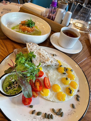 «Мама дома», одно из моих любимых мест, для завтрака в Новосибирске. Есть у них мое топ блюдо на завтрак - омлет из дюжины перепелиных яиц, но в этот раз я взял киноа с булгуром и цветной капустой. Добавил в это креветки и яйцо пашот-очень понравилось и будьте готовы- блюдо получилось очень сытным! Плюс взял эклеры с крабом-нормально, но не «wow». Оказывается , что-то в эклер кладётся , соусом поливается и запекается . В итоге типа бутерброда из микроволновки. Еще интересные «девайсы», для заваривания чая. Есть чем заняться в ожидании блюда. Важно-стол лучше забронировать перед походом туда. Если пойдете в выходные есть шанс не попасть, даже с самого утра. Резюме - ходил и буду ходить. Видно, что стараются, экспериментируют. Атмосфера, обслуживание, еда-все хорошо. А вместо эклеров - возьму на мой вкус,...