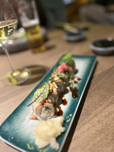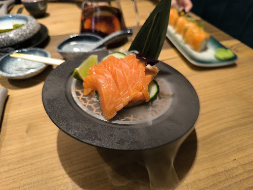Заходили на обед в выходной в тёплый день. Веранда была практически полностью занята. Зал, наоборот, был почти пустой. Администратора на входе не оказалось. К столу провожал бармен. Заказывали роллы Филадельфия, сашими из лосося, фо бо, тясю рамен и гранатовый чай с клюквой и апельсином. В качестве комплимента приносят острые стрючки фасоли, но почему-то без приборов. Приборы принесли к моменту подачи закусок. Сашими из лосося представляет из себя несколько ломтиков рыбы, водоросли, огурец, кусочек лайма. Рыба свежая, вопросов никаких. Мне вкуснее было макать её в соевый соус, чем сбрысгивать лаймом. Филадельфии было 6 кусочков. В целом добротный ролл, ничего в нём не разваливалось. В рамене лежало 3 косточка свинины, 2 половинки маринованного яйца, лапша, листик нори, грибыи острый соус в бульоне. Суп понравился: насыщенный, в меру острый. Фо сделан по типу "собери сам": бульон с лапшой и мясом в тарелке, зелень, ростки и острый соус отдельно. Фо откровенно слабоват: ненасыщенный бульон, соус, полностью портящий впечатления о супе. Делает его не столько острым, сколько сладким. Причём мы точно не первые, кто об этом говорит, поскольку первый вопрос официанта после того, как сказали ему, что суп не понравился, был: "Добавили ли вы соус". Ответили, что добавили, и он сделал суп сладким, после чего официант подтвердил такое его свойство. Чай понравился больше всего. К обслуживанию вопросов не возникло. Общий чек получился на 3455 рублей. Удобно, что можно оплатить электронно через сканирование QR на столе, чем и...