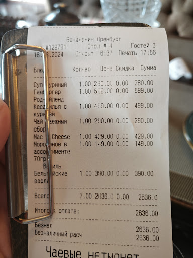 Сате с морепродуктами, не соленое, можно посолить оставим. Бургер, сколько рестораны будут использовать не качественные булки для бургеров? У вас прекрасные котлеты, но бургер совершенно не вкусный из за булки и перестаньте наконец-то пихать туда сливочное масло, это не сочетается с говядиной. Мексиканский бурито или замеченная шаурма, ее невозможно взять в руки, соус вокруг лаваша не запекается и при этом расстояние до краев слишком маленькое чтобы его можно было взять в руки, в то же время резать запеяеннцб шаурму и есть вилкой ты не можешь потому что это разваливается. Музыка слишком громкая и нет нормальной акустики она играет из одного места и вам может банально не повезти с местом, вы будете сидеть или на мягком с громкой музыкой или на деревянных стульях, но где эта музыка будет комфортна. В общем честный отзыв, честное нет и нет настолько много, что даже не хочется пробовать еще раз, такое невозможно исправить, здесь культуры и того что несет в себе ресторан нет, это дорогая забегаловка, если хотите кафе, но не ресторан...