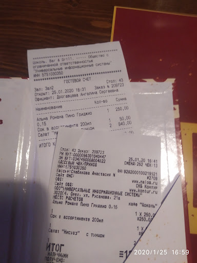 Read moreВпечатление не очень, да интересный интерьер, да частенько, аккуратненько, но персонал - не компетентный. Сначала подошла одна официантка, сделали заказ, уточнили, что необходимо по-быстрей, поинтересовались временем приготовления, указали, что 10-12 минут, попросили счёт сразу. Принесли напитки и счет. Через минут 15 прилетает администратор и без здрасте, не видя счета на столе и не обладая информацией, у вас карта или нал. Ну ок. Отдали счет, так деньги уже туда положили. Уточнили скоро ли будет готов заказ, сказала, что уточнит. Приходит через 4 минуты другая официантка(не та, что принимала заказ), возвращает счет и сообщает, что заказ будет минут через 5, уже 24 минуты от положенных 10-12, на вопрос почему так долго, ответили, что у них два корпората, попросили администратора, та сообщила, что плита сломана, через 2 минуты, появляется первая официантка с тарелками. В итоге пообщались со всеми и потратили уйму времени, которого не было, сообщили бы заранее, выбрали другое заведение. Сказали, что следующий раз сделают скидку 15%, но это было только на словах. На чеке время открытия счета, т. е. время передачи заказа на кухню, на фото время, когда еще...
