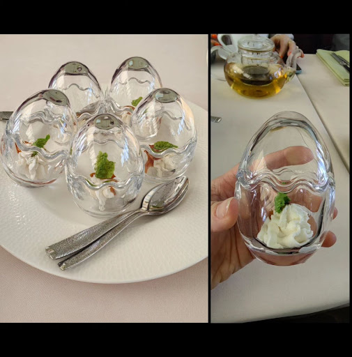 ОЧЕНЬ понравилась подача блюд. С любовью, трепетом и тщательным вниманием отнеслись к оформлению. Эстетично до безумия! Само оформление ресторана тоже очень приятное глазу - располагает к расслаблению, ненапрягу - релаксу. Я люблю оказывать внимание мелочам, деталям. Здесь меня порадовали детали интерьера - светильники в виде птиц, музыкальное лаундж-сопровождение со звуками птичек 🐦🐦. Все как-то по-душевному выверено. И меня это цепляет. Вообще, ощущение, как будто ты в гостях в чье-то гостиной. По еде (шеф повар🧑🍳Владимир Довалго. Меню состоит из сочетания средиземноморской и азиатской кухонь): СевИче из гребешка с лаймовым сорбетом и сливочным кремом (1550). Для меня это оказалось амброзией. Подача - вообще отвал всего, вкус -божественен. Шедевр. 10 из 5. Том Ям (1100). Ну вот тут не все гладко. Вкусно? - вроде, но не настолько. Бывало в других местах лучше. 4 из 5 На горячее я решила удивить саму себя и свои вкусовые сосочки 😋. Марокканский осьминог 🐙 с картофельным гратеном и каким-то очень приятным соусом (2850). Вкусно, особенно соус, сам осьминог неплох, но как будто немного как резина. Картофельный гратен таял во рту 👍 5- из 5 На десерт яйцо 🥚 "Птичье молоко" (650) - подача - вообще что-то невероятно красивое, радующее глаз. Бомба! 🧨 Отметила, что яйцо "аутентично". Расковыряв его, я дошла до "желтка". Это был манговый 🥭 джем, а вкус манго и все, что с ним связано я люблю. Bellissimo Чай авторский- Пряный с грушей🍐🍵🍐 Вкусный. 5/5 Комплимент от шефа 👨🍳 прилетел - в сосуде-яйце мусс из осьминога с соусом терияки. Интересное блюдо, но на вкус не вау. 4/5