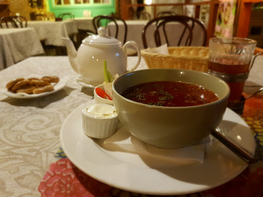 Read moreAbsolutely delicious. This "soviet-style country house cafe" has cozy and interesting decor like a 'Dascha'. They do have english menus, and their choices of food are very wide. They serve quite a variety of traditional favorites. We ended up getting a tea-service complete with a samovar, and everything from caviar and blini, to borsch, sashliki, and even deserts. The prices are lower than I would expect for being right on Nevsky prospect and so close to the palace, dom kinigi, and kazan. If you want a traditional experience, I recommend this place highly. Plus thier menu is so varied you could come back or share with people in your group and still have a wide variety to try. Everything was cooked wonderfully, and the waitstaff (which spoke a little bit of english) were very patient...