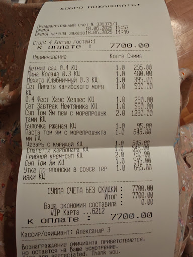 Read moreРедко пишу отзывы, однако считаю нужным это написать. Вчера посетили данное заведение, заказали еду, а перед этим спросили когда нужно назвать код карты (до или после заказа). Сделали заказ, назвали код молодому человеку….принесли счёт, оплатили. Посмотря в чек, не обнаружили проведённой карты…и пришли в шок. Спросили у администратора, на что получили ответ «мне сказали что карты у вас нет». Как так, если несколько раз мы говорили официанту про карту+он записал код. То есть, если бы мы не заметили и ушли, то переплатили бы энную сумму. Сказали что пересчитают счёт в течении 5 минут (нам нужно было уже ходить, чтобы успеть перейти мост)….и вместо пересчёта чека администратор с официантами искали потерянный айфон…..по итогу счёт пересчитали, но мы опоздали и не посетили запланированное место. Впечатление...