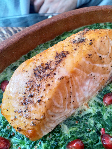 Сёмга запечённая. Цена 995р, явно завышенная. Никаких особенных вкусовых качеств не ощутила, пресный стейк, перец и вокруг шпинат в сливках. Опять же все по отдельности, не сочетается. Не удивляет своим вкусом. Оценка 3.5 из 5 за качество рыбы только.