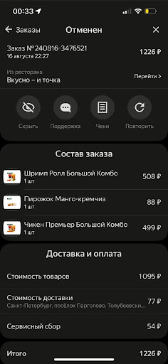 Не прошло и 5 минут, как нам прилетает отмена заказа. Мы в шоке, позвонили в поддержку и оставили свою жалобу там. Так же позвонили в заведение вновь (тоже не сразу). Опять не представились, начались отмазки, что у них нет позиций нужных (заказ сделан был на тот момент уже больше, чем 2 часа, был звонок и нам почему-то не было сказано, что у них нет нужных позиций), потом пошли отмазки, что там отменила вообще другая сотрудница. Бардак одним словом!!!