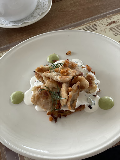 Место очень красивое,исторические дворянские палаты, но...инвалидам и взрослым с маленькими детьми в коляске здесь не поесть, очень крутые ступеньки,очень высокий подъем,мы еле еле подняли вдвоем прогулку с годовалым ребёночком. Еда разнообразная но не очень вкусная,точнее безвкусная.Были проездом в Пскове,первый день обедали по бизнес ланчу, так как торопились, и услышали разговор,что горячее,заказанное по основному меню, людям, за соседним столиком, несут уже 25 минут. Заказали всё что есть,всё три бизнес ланча. Салаты вообще никакие,витаминный,сельдь под шубой и капуста с кусочками курицы.Безвкусные, пресные. Супы- Харчо -острая вода с перловой крупой. Картофельный суп-ребенок сказал что в детском саду вкуснее. Вторые блюда- Бифстроганов- нормальное мясо испортить трудно. Рулет куриный с грибами-очень даже съедобно. Рыбная котлета-извините отстой. Пюре- из картошки, вкусное,даже годовалый поел. Компот- зачёт. Пиво-свежее. Итог : 1 165 руб.за двоих взрослых и двоих детей (5 лет и 1 год)
