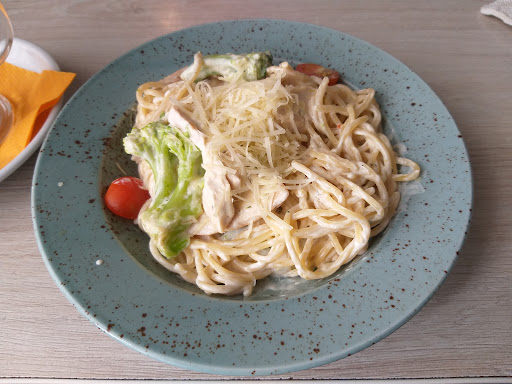 Из хорошего: приятный интерьер, вежливая официантка. Минусы (с комментариями) -Когда зашли в кафе, с нами никто не поздоровался -Знаменитых шейков, которыми славится это заведение, не было ( нет серии напитков - вытаскивайте страницу с ними из меню. Тем более раскладка меню это позволяет. И официантка не предложила напиток, который можно было бы попробовать вместо шейка ) заказали Цезарь с курицей и пасту карбонару (уверенный середнячок) из напитков заказали молочные коктейли, ванильный и шоколадный ( ребята, это полный капец! Молочный коктейль - это самое примитивное, что модно приготовить из напитков. Как модно было его испортить? По составу молоко, мороженое ванильное/шоколадное, сироп ванильный/шоколадный и взбитые сливки для украшения. Так вот на вкус это все великолепие было как обычное молоко, так ещё и взбитые сливки забыли положить. При чем эти напитки готовил бармен, которого собирались повышать на менеджера. Вы серьёзно, ребята? ну и на десерт заказали чизкейк с собой ( в кафе не оказалось тары, чтобы упаковать его с собой. Когда мы заказывали чизкейк нас об этом никто не предупредил. В итоге, кусок этого несчастного чизкейка нам принесли упакованный в какую-то бумагу и положеный в целофановый пакетик без ручек, завязаный на узелок. Чизкейк упаковать в пакетик? Вы серьёзно?)
