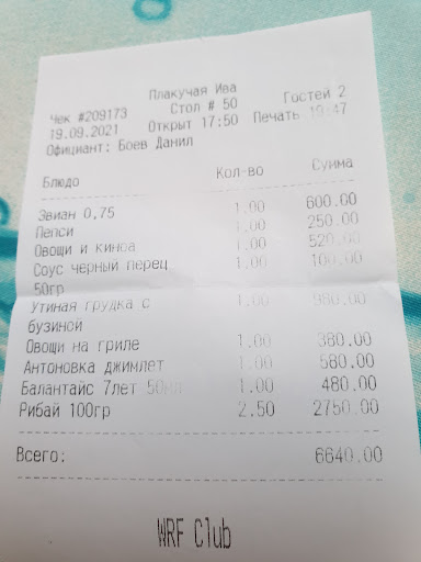 Read moreБыли 21.04.21г. в Плакучей Иве г. Сочи на Войкова,3. Из плюсов - атмосферный ресторан, приятная обстановка. Где можно было бы насладиться моментом. Но! Меню прописано очень по хитрому, например на рыбу , где отмечено «» и прописаны условия снизу в углу мелкими буквами, когда для тебя это впервые ( получить меню со «» , ты и не заметишь этот момент и закажешь так , как написано без условий ). У нас так и было : заказали форель ( при чем меня немного удивила цена 350р за блюдо , но решили , раз так написано, значит так и стоит ) Официант не предупредил о том , что 350р это не за блюдо , а за 100гр рыбы.) После трапезы мы получили чек на сумму около 3000 руб за 2 блюда . И естественно были в шоке , за что ?? Дело вовсе не в деньгах ! А в отношении ! Когда пригласили администратора, она спросила , не предупредил ли наш официант о том, что рыба рассчитана в меню на 100гр. Естественно не предупредил . Администратор обещала рассчитать на 100гр рыбы за 1 блюдо . Но и снова цена в чеке была просто снижена. А не так как мы рассчитывали . И снова обман . Сунула в честь извинения открытки , возможно это был манёвр- отвлекания . Ну ладно , решили не ругаться , отплатить и уйти.