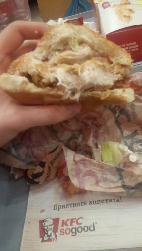 Read moreПосредственное кафе. Кухня на любителя- пресная, безвкусная.. Попробовали почти все блюда и особого различия в них не заметно. Я бы рискнул охарактеризовать их так: есть острые блюда и остальные, а остальные это абсолютно безликая масса. Вот и на этот раз, решил опробовать новый, рекламный "шедевр" KFC под звучным и многообещающем названием "Дабл Чикен Кентуки Барбекю". Что это? Это два кусочка куриного филе с кусочком малосоленого огурца и еще чего-то между ними. Как можно охарактеризовать вкус данного изделия - ни о чем. Ни чего нового и особенного. Острота,Острота и только где-то по середине малосоленый огурчик. После употребления в пищу этой новинки, утверждаюсь в правоте высказывания, что не все то золото,что блестит, а в KFC как готовили "тоску", так и не сделали ни чего нового. Коллектив который там работает, про них такого не скажешь. Ребята молодцы, вежливые и приветливые, с улыбкой встретят и добрым словом проводят. Хочется пожелать что-бы технологи KFC, взяв пример с ребят, изменили рецептуру своих "шедевров", сменив уныние...
