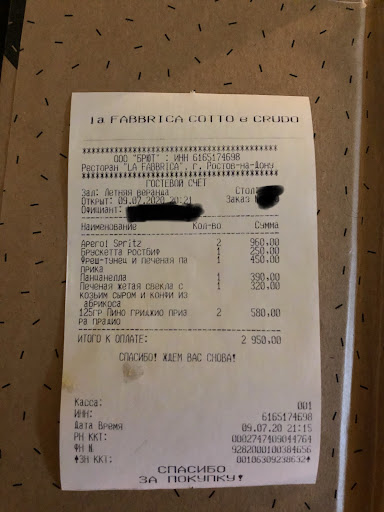 Read moreВчера мы с супругой наконец-то посетили так давно рекламируемое и обсуждаемое заведение “Ла Фаббрика», что на улице Красноармейской. Плюсы: отличные интерьеры, красивый туалет. Минусы, о них по порядку. Во-первых, в виде аперитива заказали апероль-шприц, по 450 руб за порцию, что, мягко скажем, немало, даже для дорогой Европы. Состоял коктейль изо льда, какой-то жидкости без запаха алкоголя (видимо минералки) и такого малого количества самого Апероля, что выглядел коктейль почти прозрачным. Ни вкуса, ни цвета, ни запаха, ни алкоголя мы не получили, а 900 рублей как не бывало. Во-вторых, позвали официанта, принимает он у нас заказ, вдруг подходит к нему администратор, протягивает миску с какой-то едой и говорит «На тот стол поставь» и машет на соседей. Официант, как будто не со мной разговаривает, разворачивается и послушно несёт блюдо, а я остаюсь сидеть с открытым ртом, так как в этот момент собственно, делал заказ. Такого отношения к клиенту я даже в дешевых пляжных столовках не видел. Благо хоть вернулся. Заказ принял, устно. Потом забыл, подошёл и ещё раз уточнил. Ладно. Салаты и брускетты немного исправили впечатление (вполне съедобные). Ну вот и основные блюда: выгладят отлично, запах отличный, на вкус тоже очень даже ничего, у меня паста, у супруги равиоли. Думали, все ок. Ан нет. Поднимает супруга очередной равиоли вилкой, а там ... смачная такая жирная длинная чёрная волосина лежит. В-третьих, как говорится. Аппетит и остатки расположения как рукой сняло. Подозвали мы администратора, предъявили находку, блюда унесли. Счёт за съеденное/выпитое принесли - 3000 руб (хотя я на их месте после такого фиаско о деньгах бы и не заикнулся). Итог: пафоса море, цены высокие, апероль-вода, отношение как к бедному родственнику, которого надо терпеть, в еде волосы. 1 звезда - за мозаики на стенах, больше...