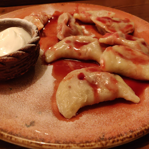 Вареники представляли собой упругое тесто с щедрой начинкой из вишни. Сладкие, с приятной кислинкой. Подавались с ягодным соусом и сметанкой, присыпанной сахарной пудрой.