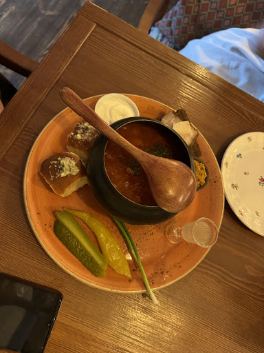 Read moreКаждый день мой путь домой лежит через данное заведение. И вот наконец-то я не прошла мимо, а окунулась в славянские традиции. В первую очередь Вас встречает поистине домашняя атмосфера. Ты будто оказался в доме-мазанке у прабабушки, где центральное место занимает печка, на потолке балки, белые-белые стены,деревянная добротная мебель и ароматы вкуснейшей еды. Персонал в нарядных народных костюмах, а на фоне задорные ритмы украинских застольных песен. Невозможно остаться равнодушным, а ведь ты ещё даже не вкусил еды.