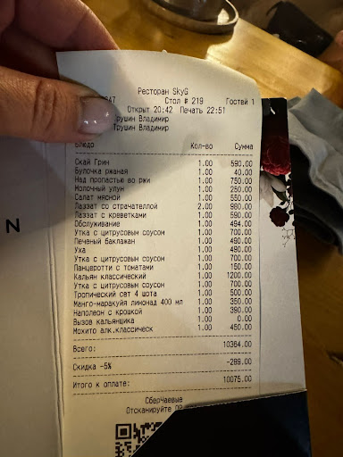 Read moreЗаведение с прекрасными интерьером но нас посадили в ту часть зала, которую не коснулась рука дизайнера. Еда посредственная. Карпаччо из копчёного угря, цезарь с курицей, мадагаскарские креветки на льду и шашлык. Карпаччо из копченного угря. Принесли недоспелый авокадо на обычном сливочном сыре, сама рыба была не плохая. Шашлык. Ровно такой же можно попробовать в любой забегаловке за стоимость в разы меньше. Цезарь. Классический салат. Ничего особенного не ожидалось. Мадагаскарские креветки - самые обычные креветки (штук 10, не больше). Купите, сварите, разложите на лёд и киньте дольку лимона. Из всего заказанного порадовал только глинтвейн, его советую. Хотите вы или нет 5% от суммы счета вы оставите за обслуживание понравится оно вам или нет. Лично мы не можем сказать ничего хорошего об обслуживании По большому счету на 5 можно оценить только удачную декорацию к...